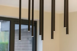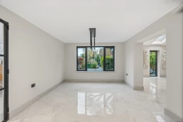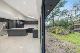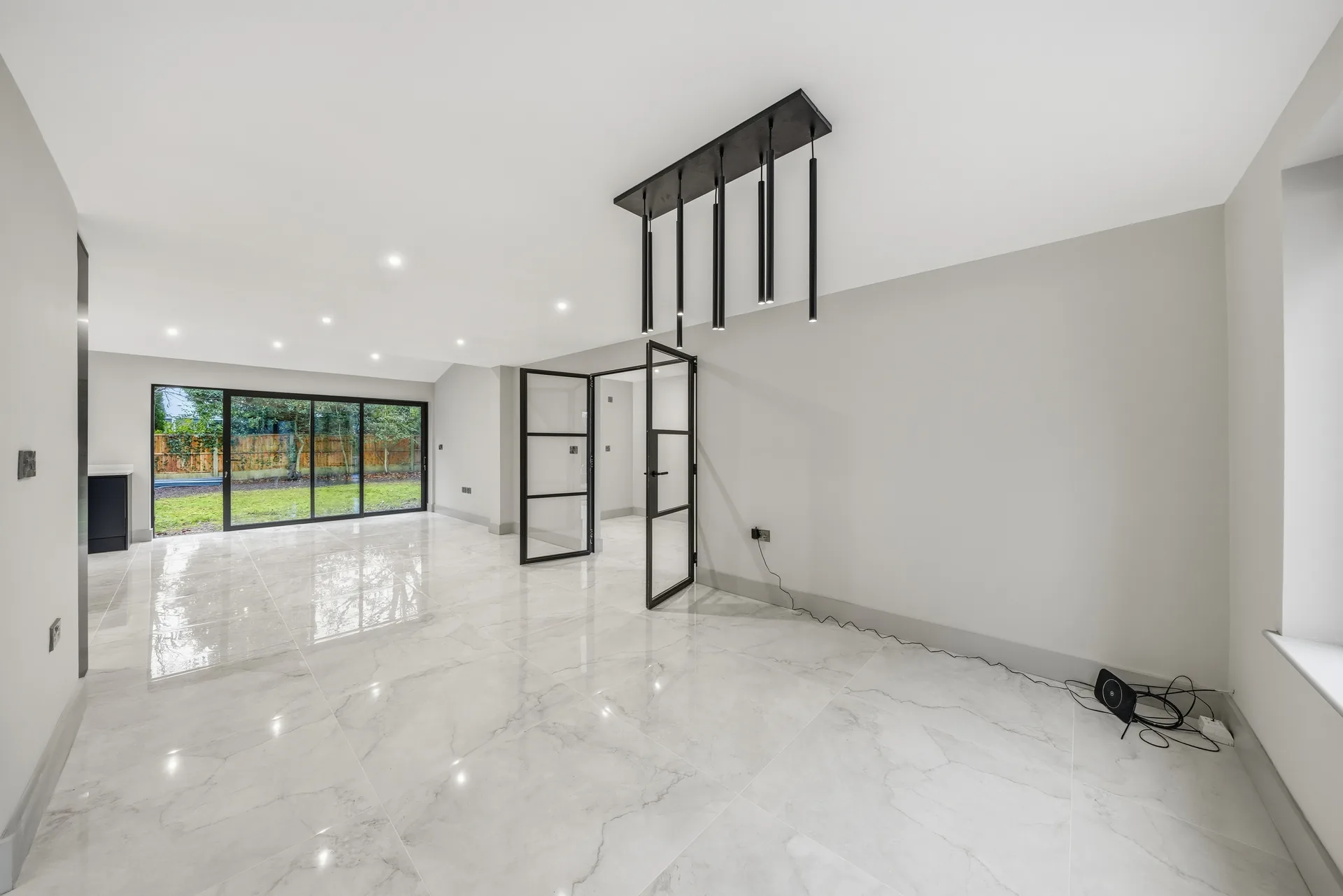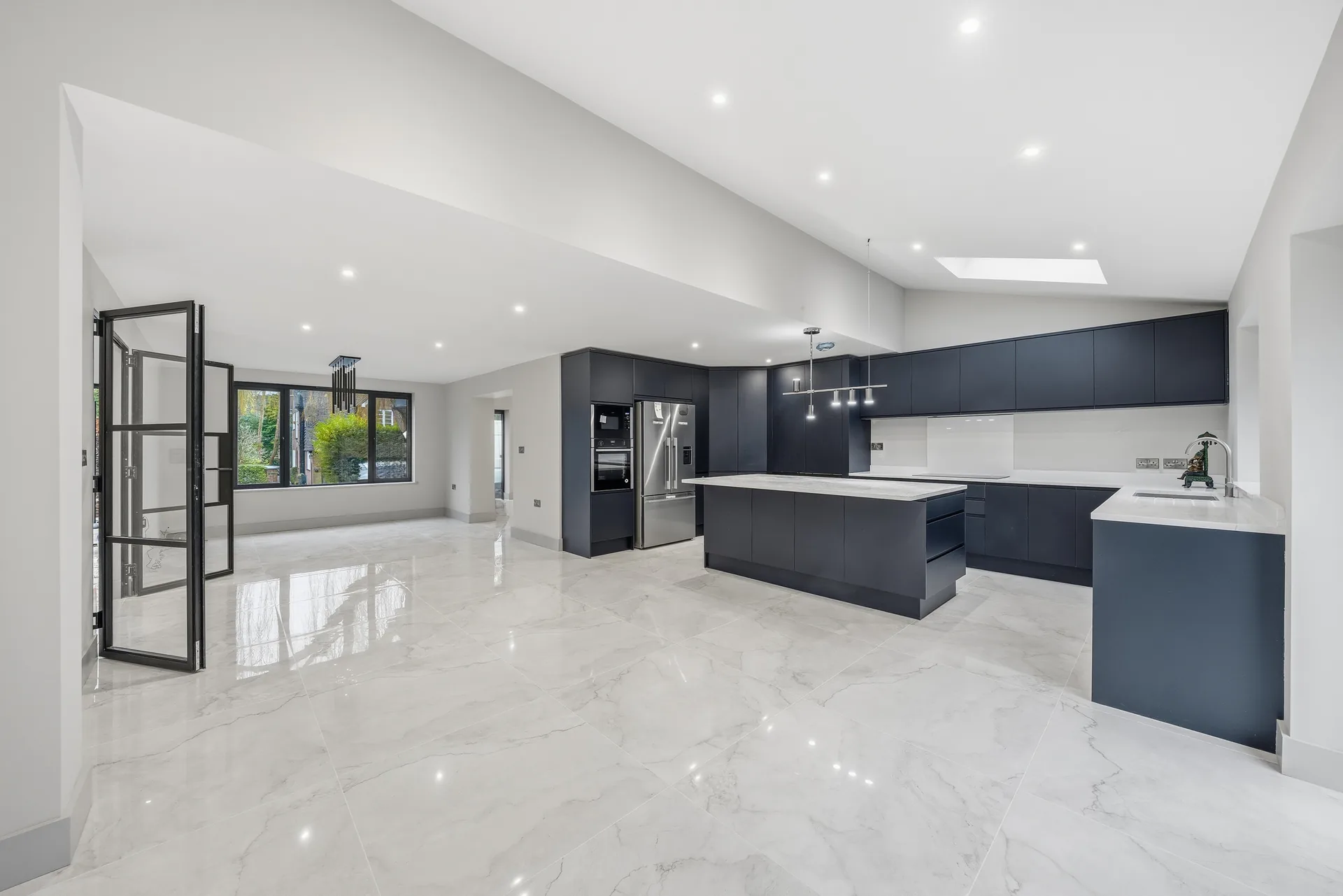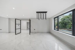 Our work includes a full internal reconfiguration and rear extension to create a modern, open-plan layout. We have rotated the staircase to open up the ground floor and improve the flow between spaces. The rear extension extends the kitchen into a spacious living area, with large bifold doors that will connect the interior to the private, tree-lined garden.